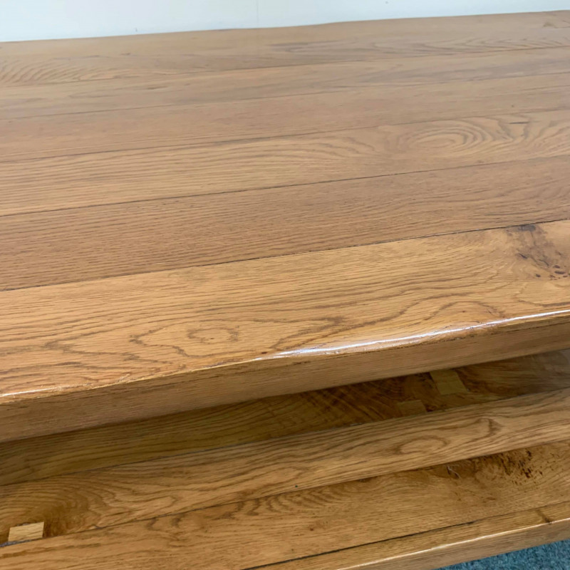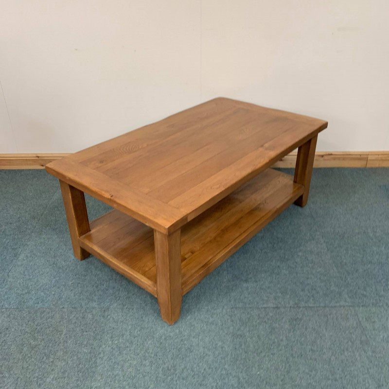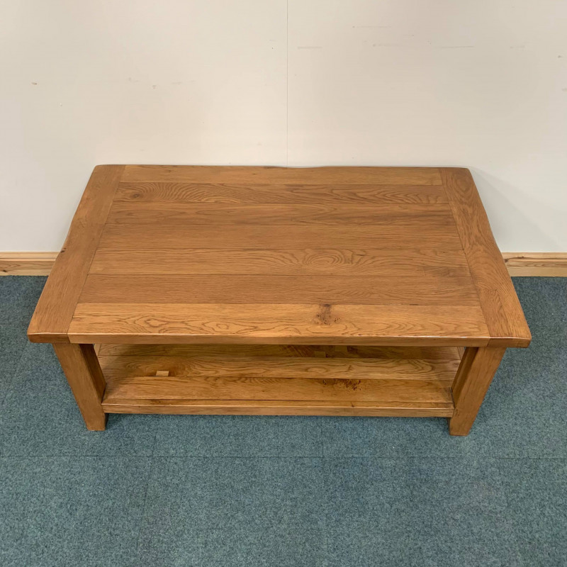 This large, oak coffee table has beautiful wood grain throughout and is perfect for someone wanting that spacious, standard shelved layout.