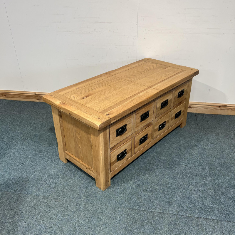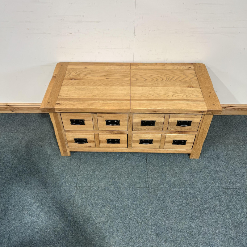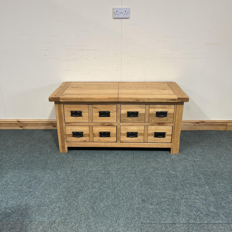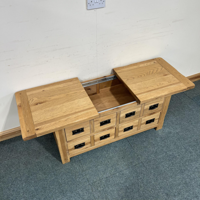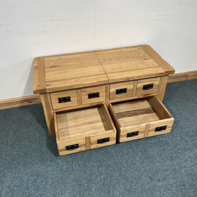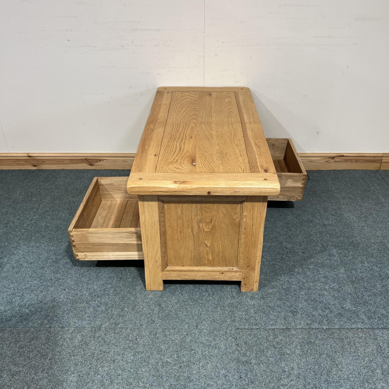 This large, solid oak coffee table is extremely useful having both drawers and a box space which you can access from either side. It has 2 large drawers at the bottom which go through to either side and then a good box space inside which reaches down into the space behind the above false drawers.