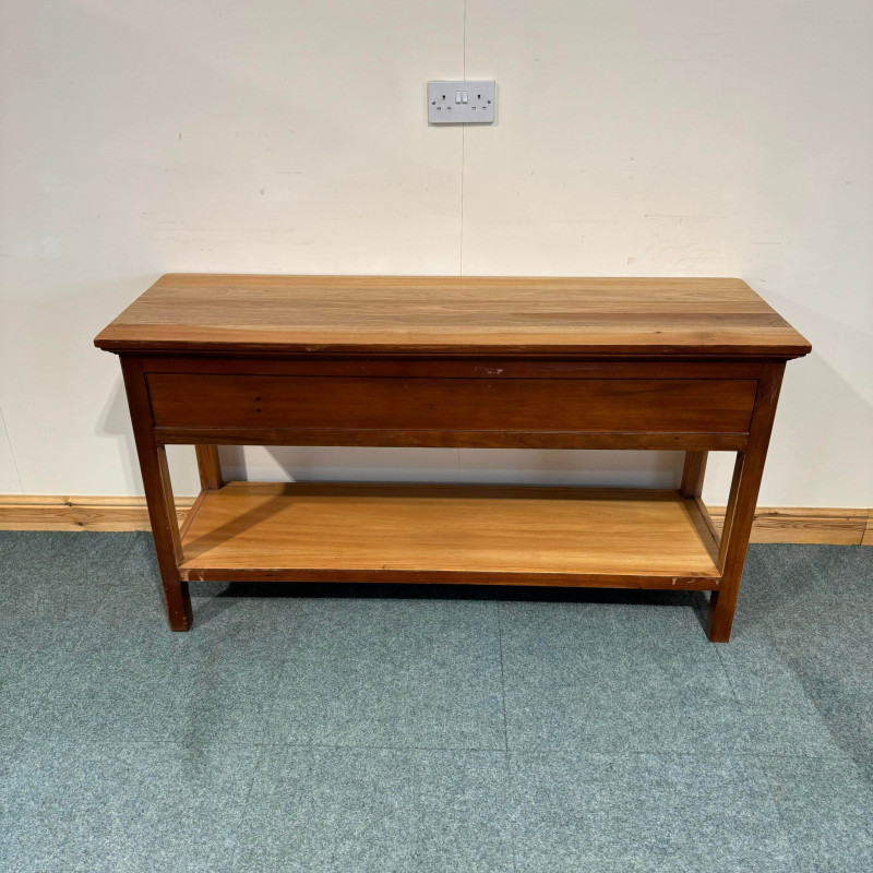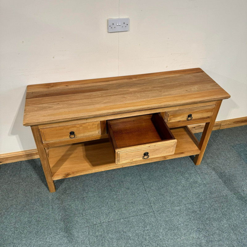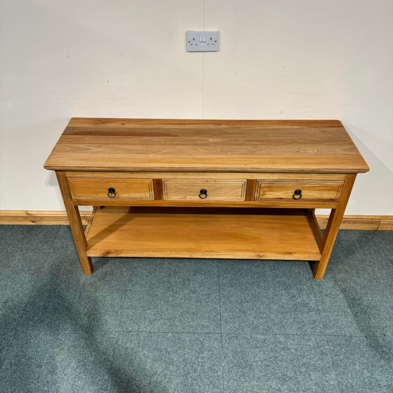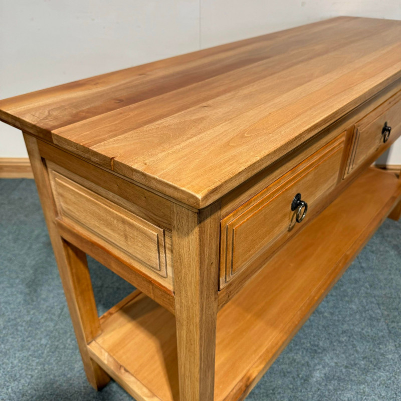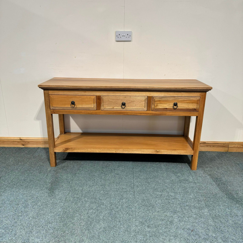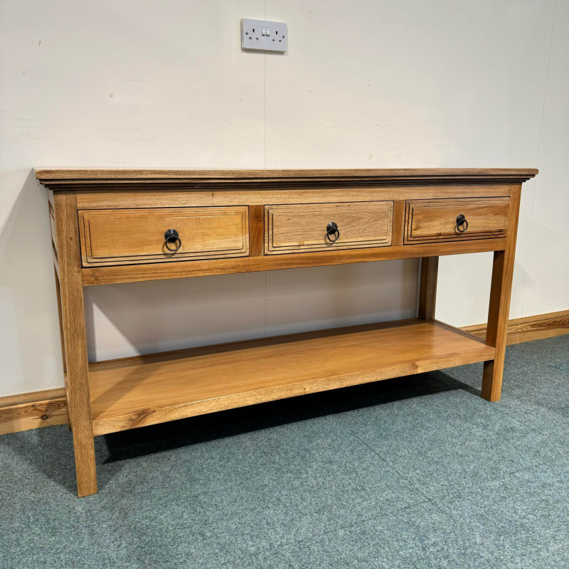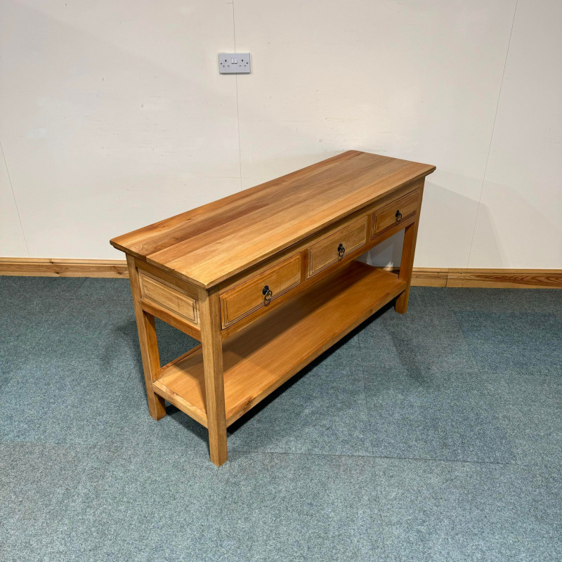 This large, satin wood console table has good storage space with big drawers and a shelf with plenty gap below. This console features lovely raised panel sides which match the drawer design as well.