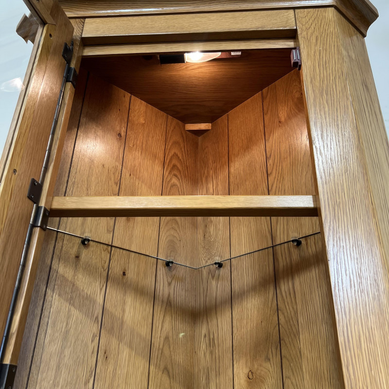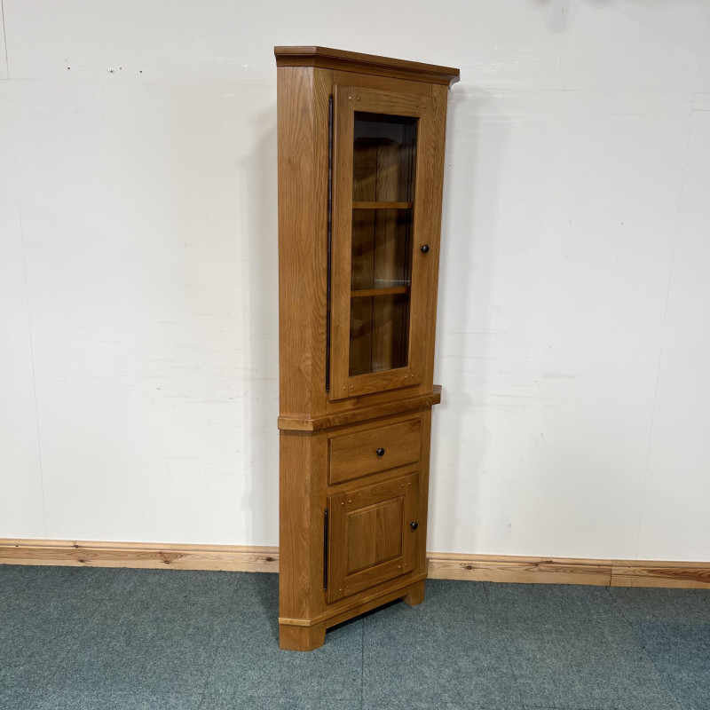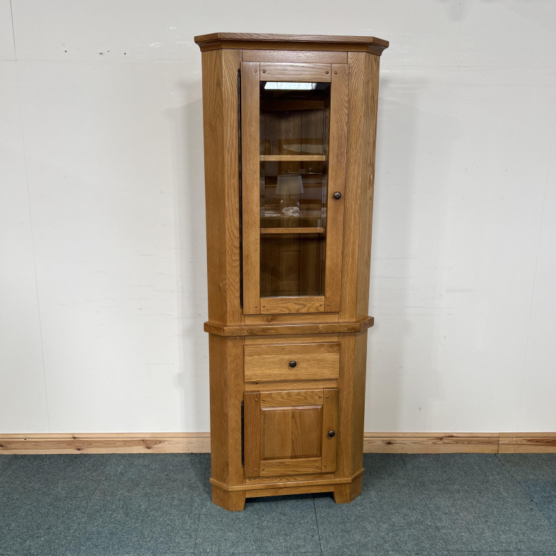 This oak corner unit has a false drawer but the space is used to make the lower cupboard higher inside. The unit also has a good light at the top which plugs into the mains.