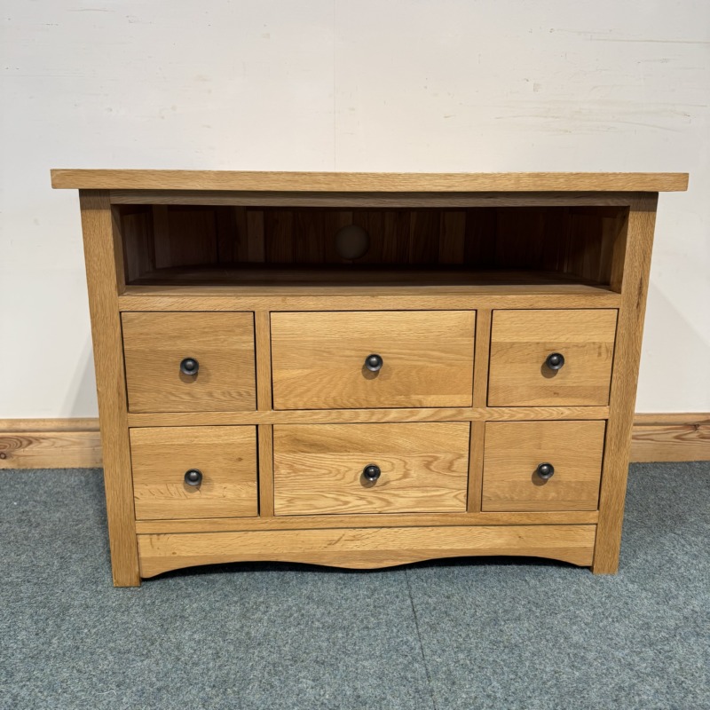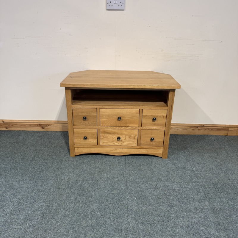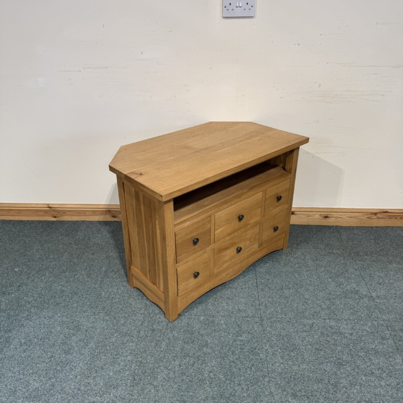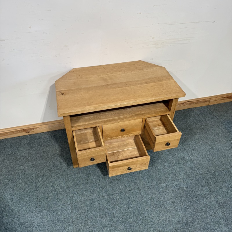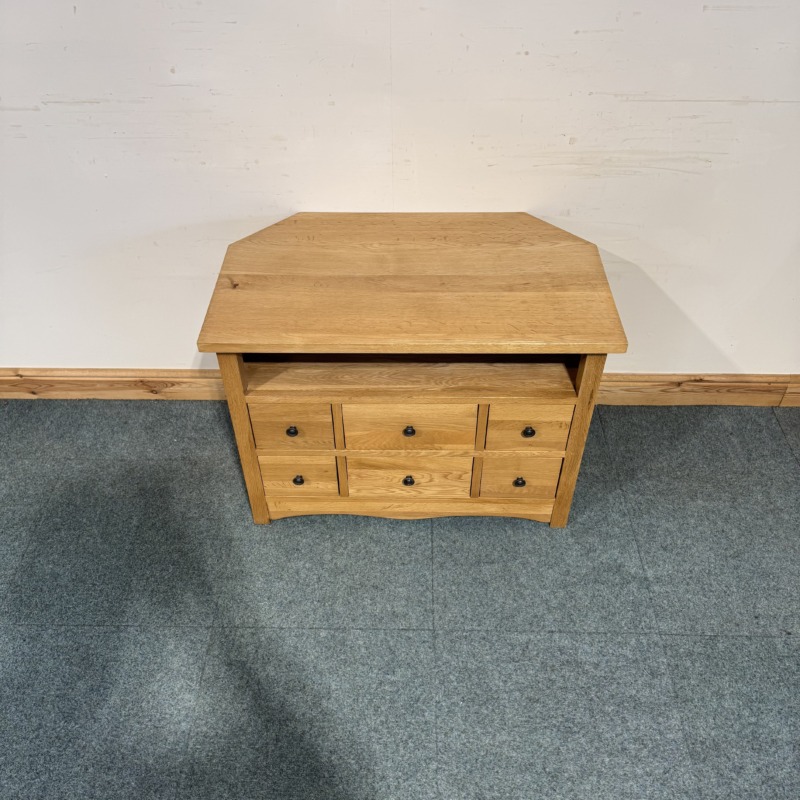 This medium sized, oak corner TV has beautiful wood grain throughout, a good shelf for tv boxes and 6 deep drawers.