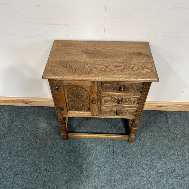 This medium sized, oak pedestal cabinet has a little cupboard and 3 good sized drawers that could be used as a lamp table or as a very small sideboard even and is perfect for a little extra storage space.
